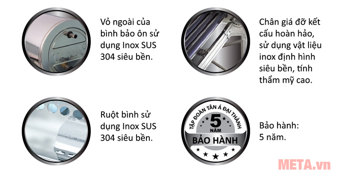 Vỏ bình bằng inox 201 sáng bóng, bền đẹp và hạn chế gỉ sét khi tiếp xúc thường xuyên với nắng mưa. Khung đỡ làm từ inox 430, cứng cáp và vững chắc, chịu được sức nặng của cả bình chứa và nước bên trong.