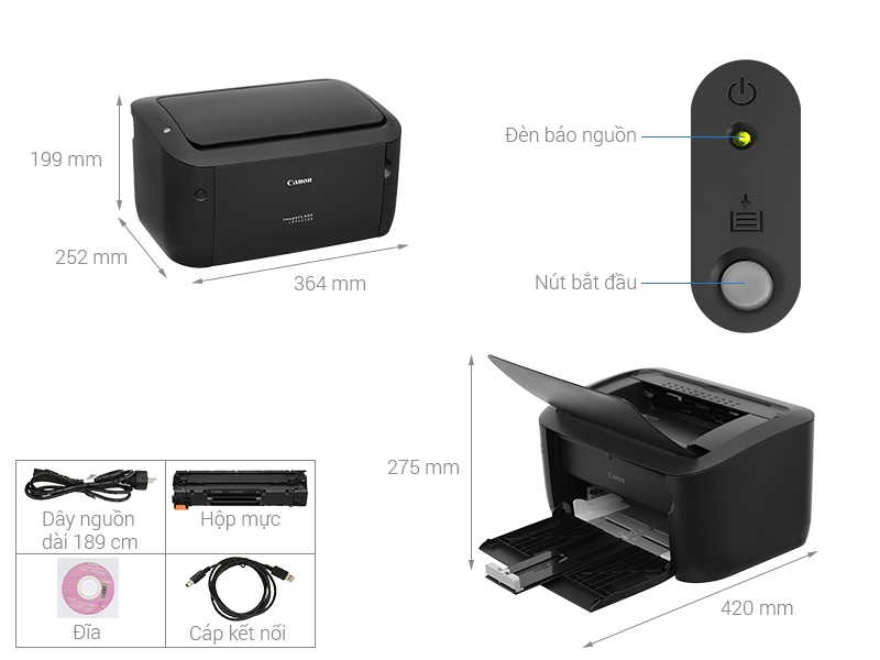Máy in Canon LBP6030B sở hữu kích thước 364 x 249 x 199 mm, trọng lượng 5 kg, phù hợp cho không gian làm việc nhỏ gọn. Với lớp vỏ ngoài màu đen sang trọng và chất liệu nhựa cao cấp, máy không chỉ bền bỉ mà còn mang đến sự chuyên nghiệp cho không gian văn phòng. Thiết kế tối giản với các khay giấy gấp gọn linh hoạt giúp tiết kiệm diện tích đáng kể.