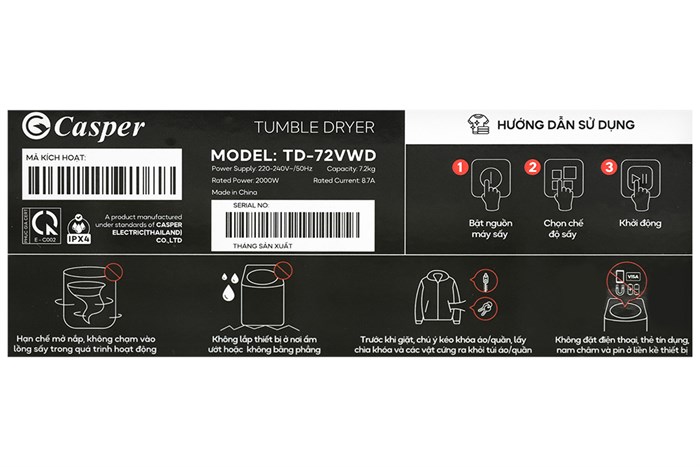Máy sấy quần áo Casper 7.2 kg TD-72VWD sở hữu ngôn ngữ thiết kế tối giản, màu Trắng thanh lịch dễ dàng hòa hợp với mọi kiểu trang trí nội thất. Ngoài ra, máy sấy Casper thế hệ mới này còn được tích hợp hàng loạt công nghệ và tính năng hiện đại như: công nghệ Sấy thông hơi giúp sấy nhanh chóng và tiết kiệm điện; tính năng Chống nhăn giảm rối xoắn và các nếp nhăn; Chế độ Refresh loại bỏ các mùi khó chịu trên quần áo,... Hơn nữa, với 16 chương trình sấy và khả năng sấy lên đến 7.2 kg quần áo, chúng đảm bảo đáp ứng được nhu cầu sử dụng cho các gia đình có khoảng 2 - 3 người.